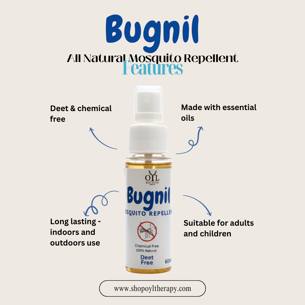 Stay safe and secure from the pestering mosquitoes with Bugnil, a premium all natural mosquito repellent made with specially selected essential oils. Suitable for adults and kids, this mosquito repellent is long lasting and works both indoors and outdoors. Bugnil is an effective guard against mosquitoes for the entire family.