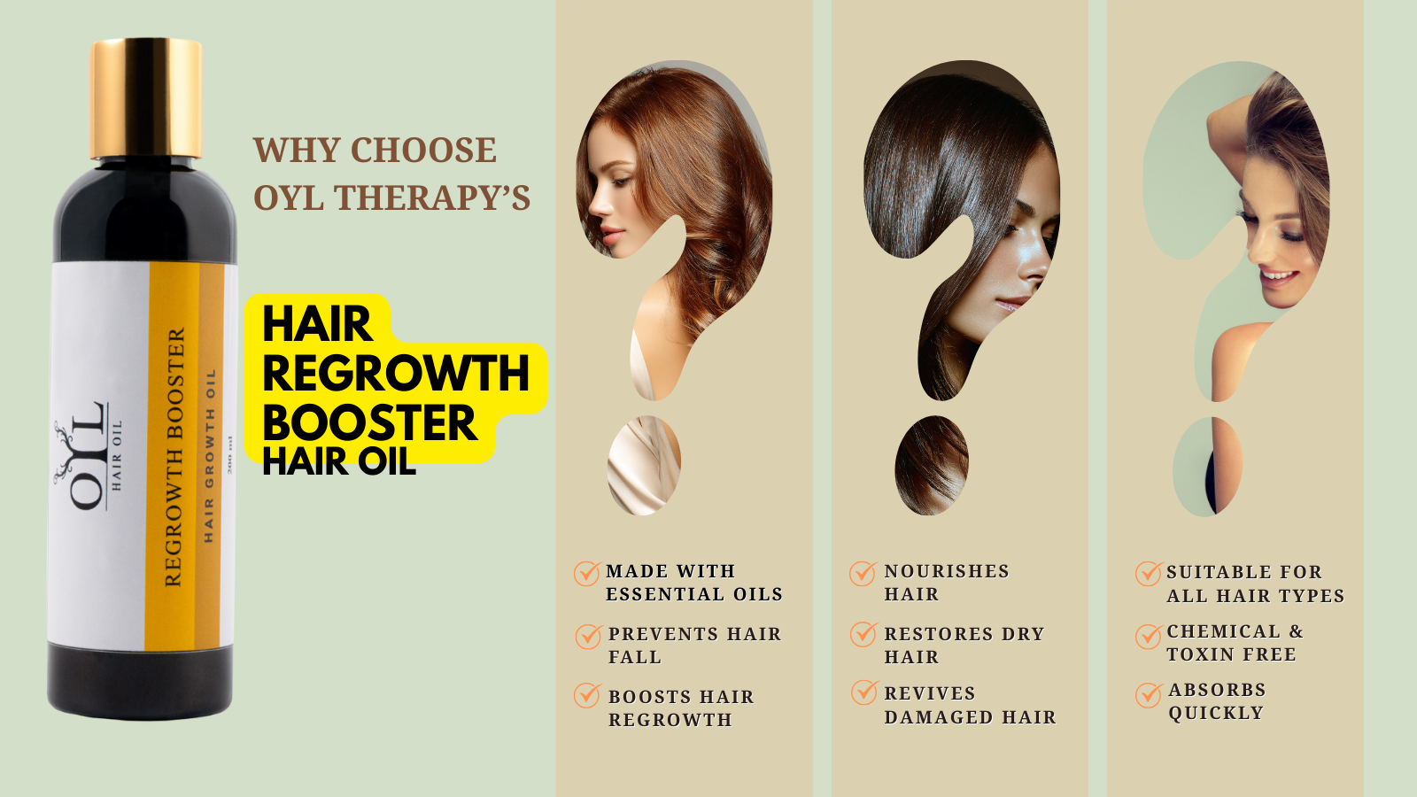 OYL Therapy's essential oils enriched hair oil is the best solution for hair fall, dry, fizzy, damaged and dehydrated hair. Blended with essential oils of Rosemary, Lavender, Peppermint with Coconut oil, this special hair oil formulation will improve circulation, strengthen hair follicles, prevent hair fall and boost hair regrowth. Suitable for all hair types. Buy now.