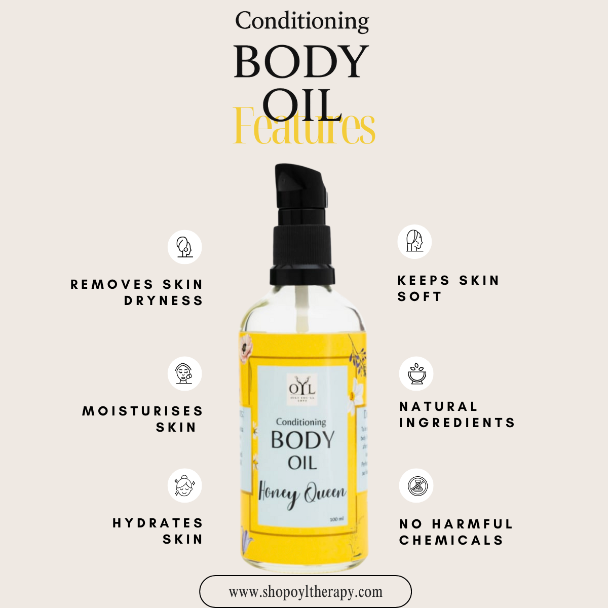 Say goodbye to skin dryness and say hello to OYL Therapy's Conditioning Body Oil. Blended with MCT oil and Jojo oil, this body oil is fast absorbing, does not leave any residue and smells great. Specially formulated for our climate, this body oil will remove skin dryness, improve skin texture and soften your skin surface. Ideal solution for coming winters. Available in two variants Honey Queen and Serenade. Order now.
