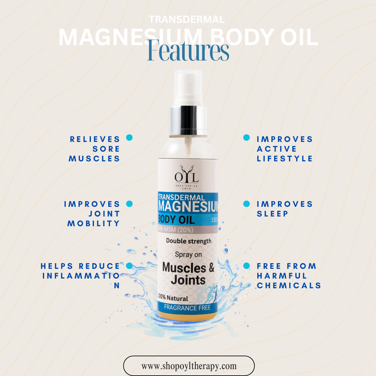 OYL Therapy's Transdermal Magnesium Oil is a potent natural blend that deeply penetrates to help reduce inflammation, relax sore muscles, and support joint mobility. Magnesium relieves cramps and stiffness, while MSM enhances recovery and soothes discomfort. Fast-absorbing and non-greasy, Magnesium Oil provides effective, natural relief for an active, pain-free lifestyle for the entire family.