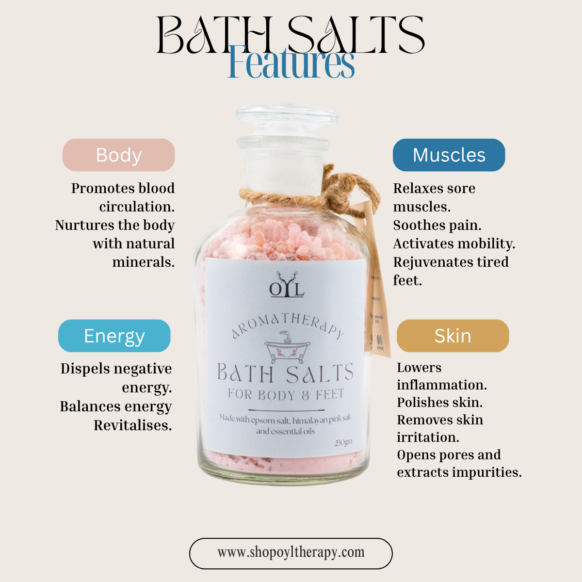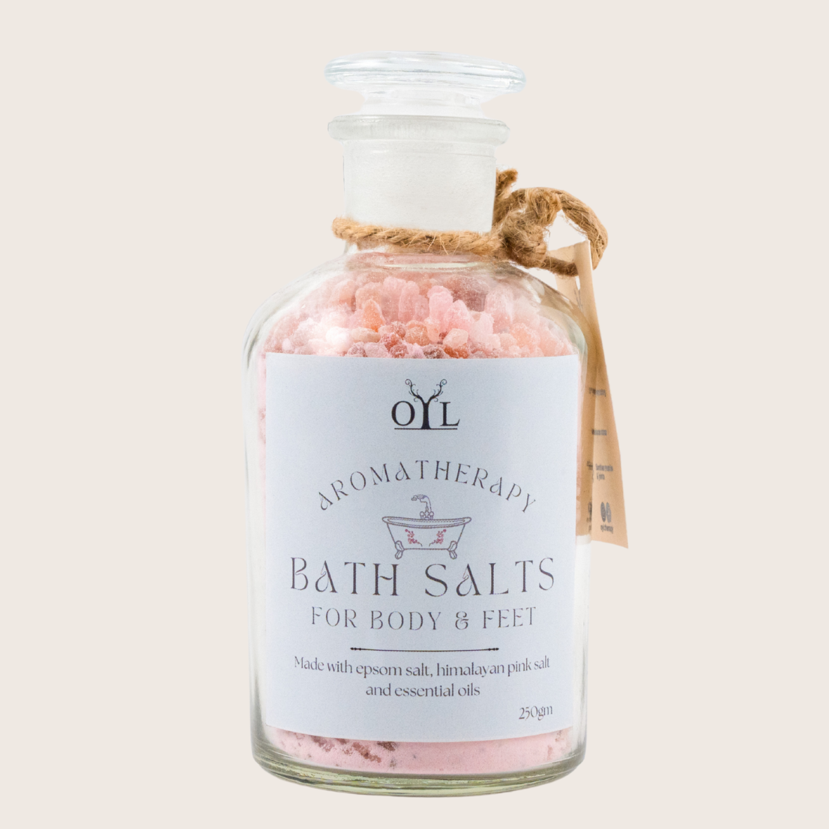 Indulge in a luxurious spa-like experience with OYL Therapy's Bath Salts, a soothing blend of Epsom salt and Himalayan salt infused with calming lavender essential oil, designed to relax your body, ease muscle tension and soften your skin. This mineral-rich soak transforms your bath experience into a rejuvenating retreat, promoting deep relaxation, improving sleep and overall well-being.
