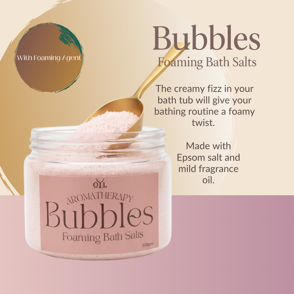 Enjoy a soothing bath experience with OYL Therapys's Bubbles Foaming Bath Salts, crafted with Epsom Salt with mild fragrance oil and a foaming agent. The creamy fizz in your bath tub will give your bathing routine a foamy twist. As the fizz dissolves in warm water, it releases relaxing minerals to ease tension and promote relaxation. This luxurious bath addition helps to relieve muscle soreness and stress, leaving your skin soft, refreshed and your mind at ease.