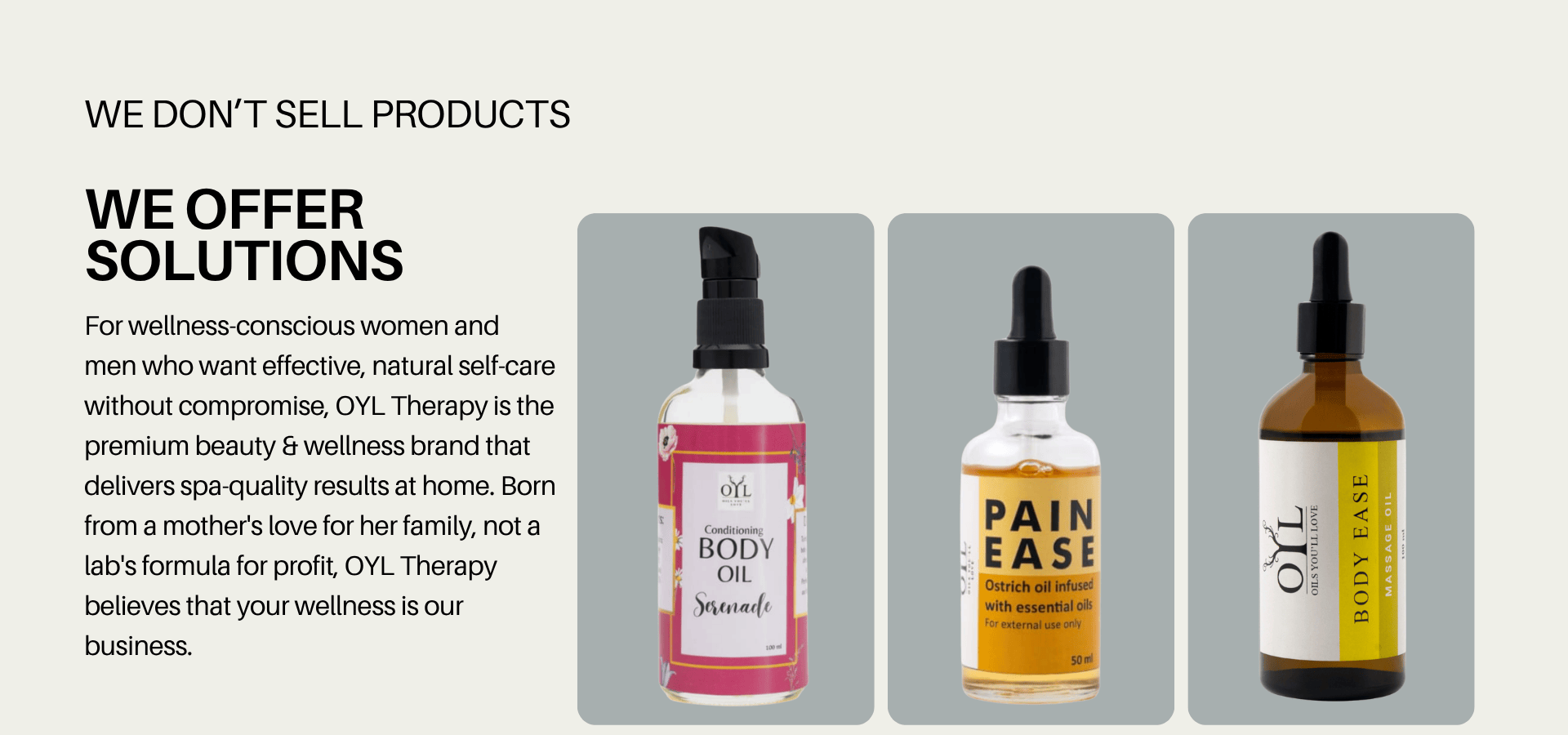 At OYL Therapy, we use essential oils and other natural ingredients — no fillers, no artificial shortcuts, no harmful chemicals. Each formula is specifically designed for Pakistan's climate. From skin to hair care, body to emotional harmony, we've blended nature's most potent oils into specially crafted wellness rituals that actually work.